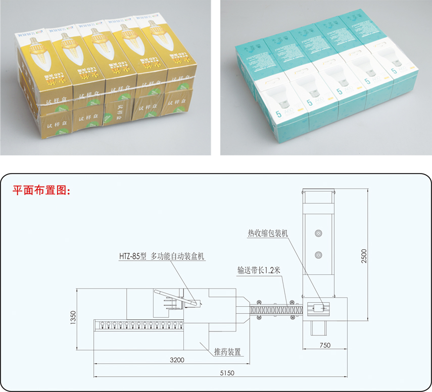 The production line is a conveyor belt production line modular combination, completing material cartoning and heat shrink packaging with optical, electrical, mechanical and pneumatic integration. It carries out synchronous production according to the PLC computer and integrated control system to form an automatic production line.