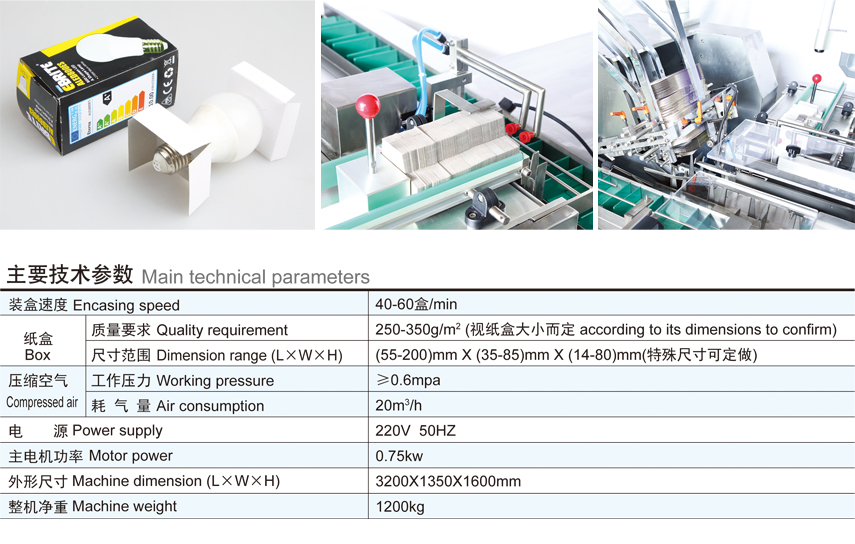 This product is a new type of advanced packaging machinery ,which combines the advanced technology of foreign packaging machines with the actual conditions of the current lighting, electronics and other industries. It is a high-tech product integrating machine, electricity, gas and light. This product is suitable for all kinds of bulbs, candle lights, etc. in the lighting, electronics and other industries, as well as the packaging of similar items. It has the functions of automatically opening the carton, automatically feeding the two inner linings, packing the boxes with the inner lining, sealing the box, etc. At the same time, it is also an advanced automatic packaging equipment that solves the current ificult recruitment and difficult management and replaces the labor. The machine can be used alone or in conjunction with other equipment to form a complete production linkage line.