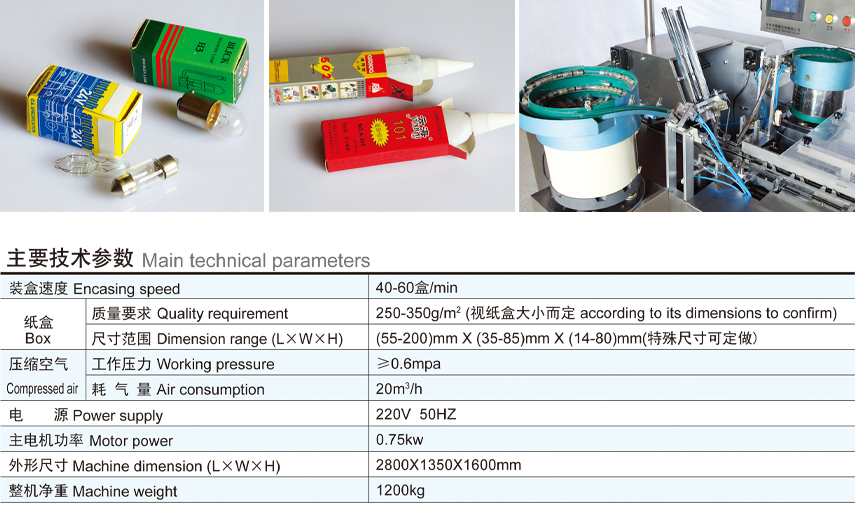 This product is the latest type of advanced packaging machinery ,which combines the advanced technology of foreign packaging machines with the actual conditions of the current lighting, electronics and other industries. It is a high-tech product integrating machine, electricity, gas and light. This product is suitable for the packaging. packaging of similar light bulbs, electronics, etc. in lighting, electronics, hardware and other industries. After being fed by the vibrator, it is automatically added to the carton conveyor belt for cartoning or directly into the box through the vibrator to carry out the cartoning. The machine also has the functions of automatically opening the carton, cartoning the goods, sealing the box, etc. At the same time, it is also an advanced automatic packaging device that solves the current dificult recruitment and dificult management and replaces the labor force. The machine can be used alone or in conjunction with other equipment to form a complete production linkage line.